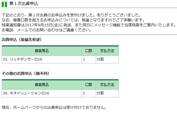 2017年度1歳馬募集・申込み状況の中間発表 (17/9/5)